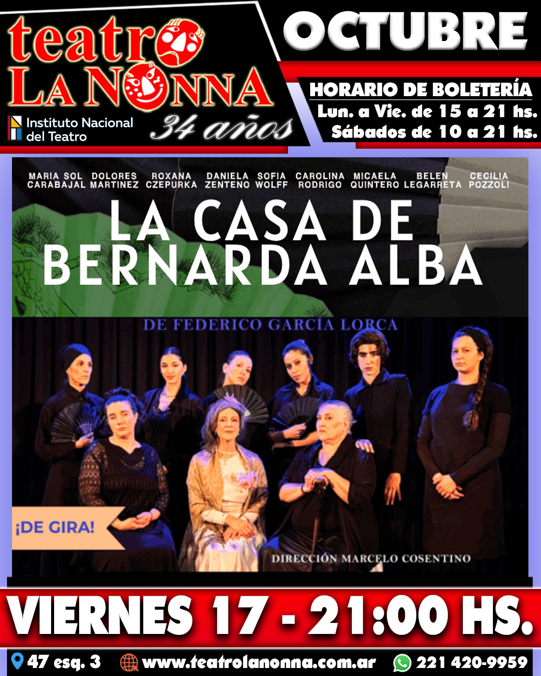 9 MUJERES: 9 Mujeres es una cooperativa teatral compuesta por actrices que apostaron por llevar a cabo una de sus obras favoritas: La Casa de Bernarda Alba. Esta propuesta independiente busca transportar al espectador a otro mundo, generando un recorrido emocional que va desde la risa hasta la emotividad, todo mientras se cumple el sueño de hacer teatro.