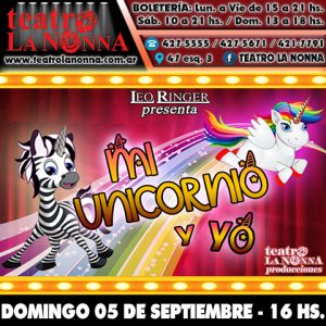 Un nuevo desafío de Leo Ringer. De la mano de un creador platense, los míticos personajes regresan a la fantasía del teatro, contando una historia de inclusión y lección de vida, donde niños y mayores disfrutan de un texto acorde, musicalización adaptada a todos los gustos, con mensajes directos y eficaces. Intrigante, divertida y rítmica, «Mi Unicornio y yo» deja todas las respuestas dadas a grandes y chicos, de la mano de estos inextinguibles personajes.